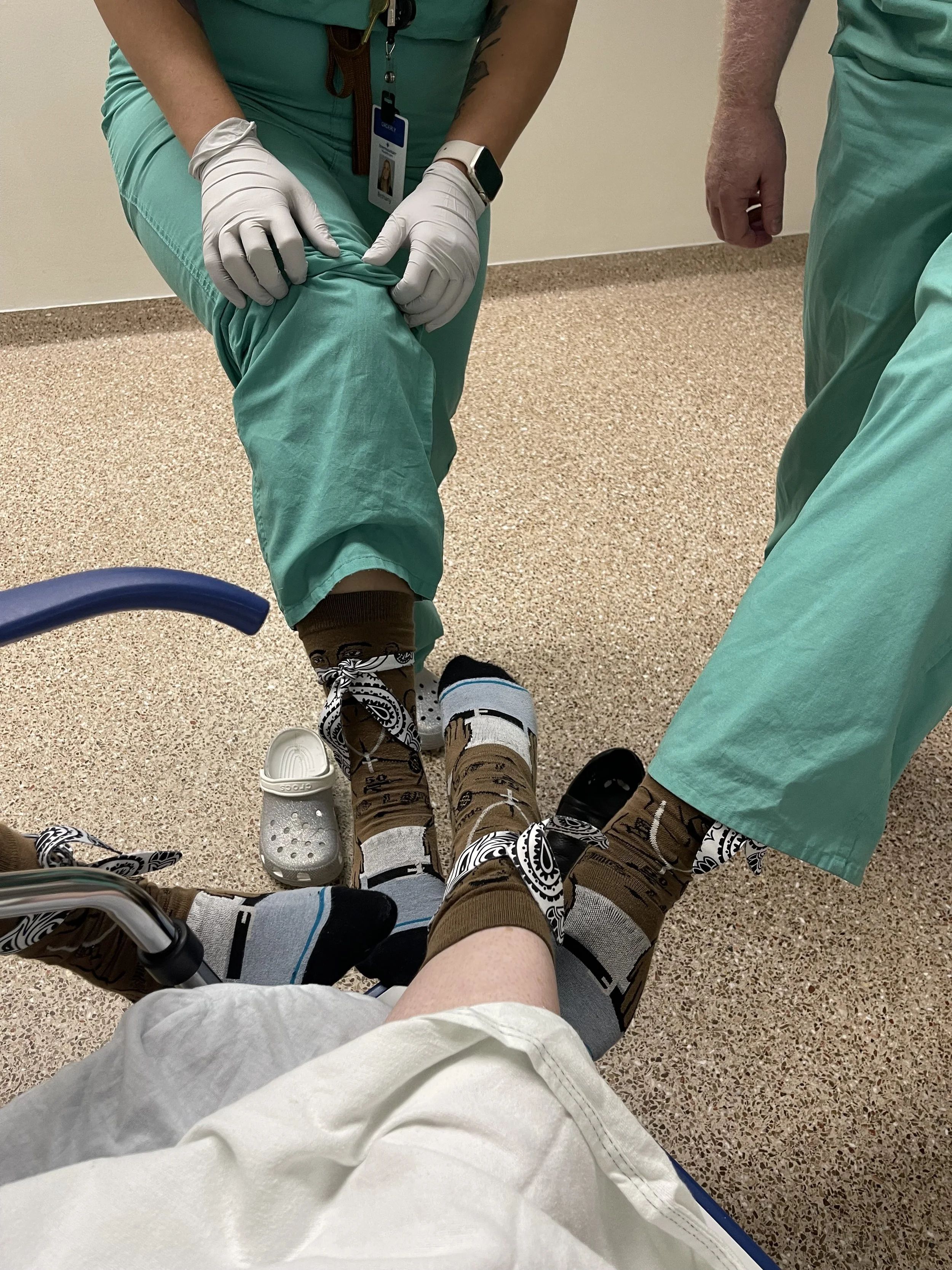 The nurses, doctors, and hospital staff lit up when they saw them. They commented on the socks, laughed, connected. It broke the tension. It softened the room. And slowly, relationships began to form.